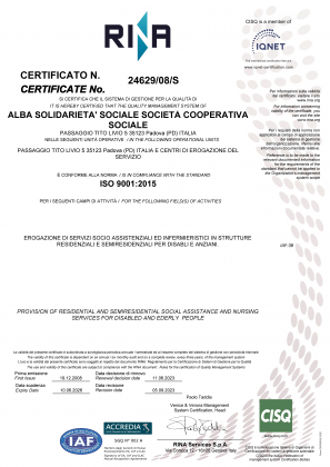 Alba Cooperativa Sociale è in possesso di certificazione di qualità secondo la norma UNI EN ISO 9001:2015 relativamente alla “Progettazione ed erogazione di servizi socio-assistenziali ed infermieristici presso strutture pubbliche e private”.
